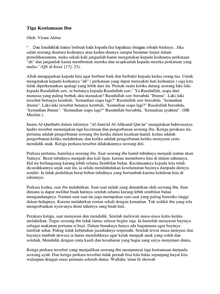 Islamindonesiaid keutamaan ibu dalam pandangan islam. Ia menjawab ya maka beliau pun bersabda pulanglah kepada kedua orang tuamu lalu berbuat baiklah dalam mempergauli mereka hr. Ungkapan surga berada di bawah kaki ibu merupakan ungkapan yang bersumber dari hadits dan menunjukkan betapa luar biasa keutamaan berbakti kepada ibu.