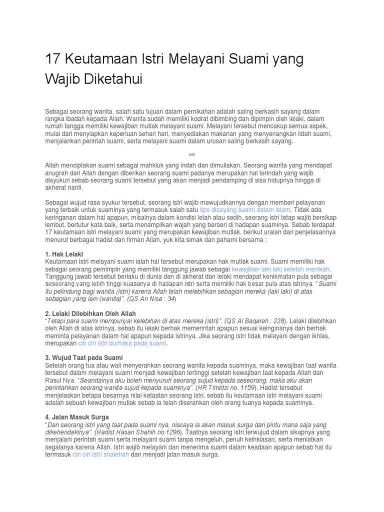 Bila seorang suami pulang kerumah dalam keadaan gelisah dan tidak tentram kemudian sang istri menghiburnya maka ia akan mendapatkan setengah dari pahala jihad. Hal ini menandakan jika kebaktian kepada suami merupakan suatu yang sangat penting dan bahkan membawa keberkahan baik itu untuk dirinya suaminya dan keluarganya. 17 keutamaan istri melayani suami yang wajib diketahui diuraikan berdasarkan firman firman allah dalam al quran dapat menjadi pengetahuan islami untuk anda atau sebagai panduan dalam kehidupan rumah tangga sehari hari agar menjadi istri sholehah dalam menggapai ridho nya.