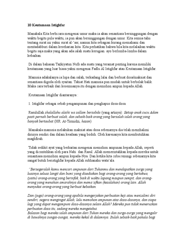 Keutamaan istighfar dalam al quran dan hadist. Istighfar ini sudah sangat sering diucapkan dan keluar dari mulut seseorang ketika sedang megalami masalah ataupun ketika sedang berada dalam keadaan yang tertekan dan bingung. 20 dan mohonlah ampunan kepada allah.
