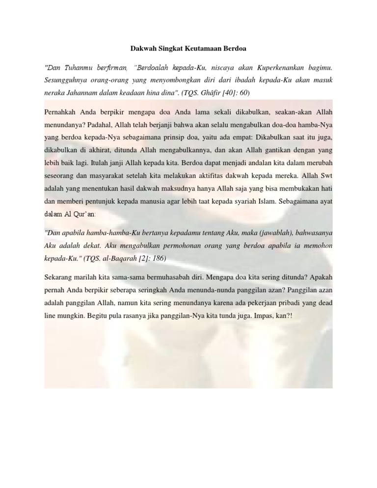 Ayat tersebut memerintahkan agar kita gemar berdoa kepada allah swt. Doa itu amat bermanfaat dengan izin allahmanfaat doa ada dalam tiga keadaan sebagaimana yang disebutkan dalam hadits berikut. Kedudukan doa doa para nabi.