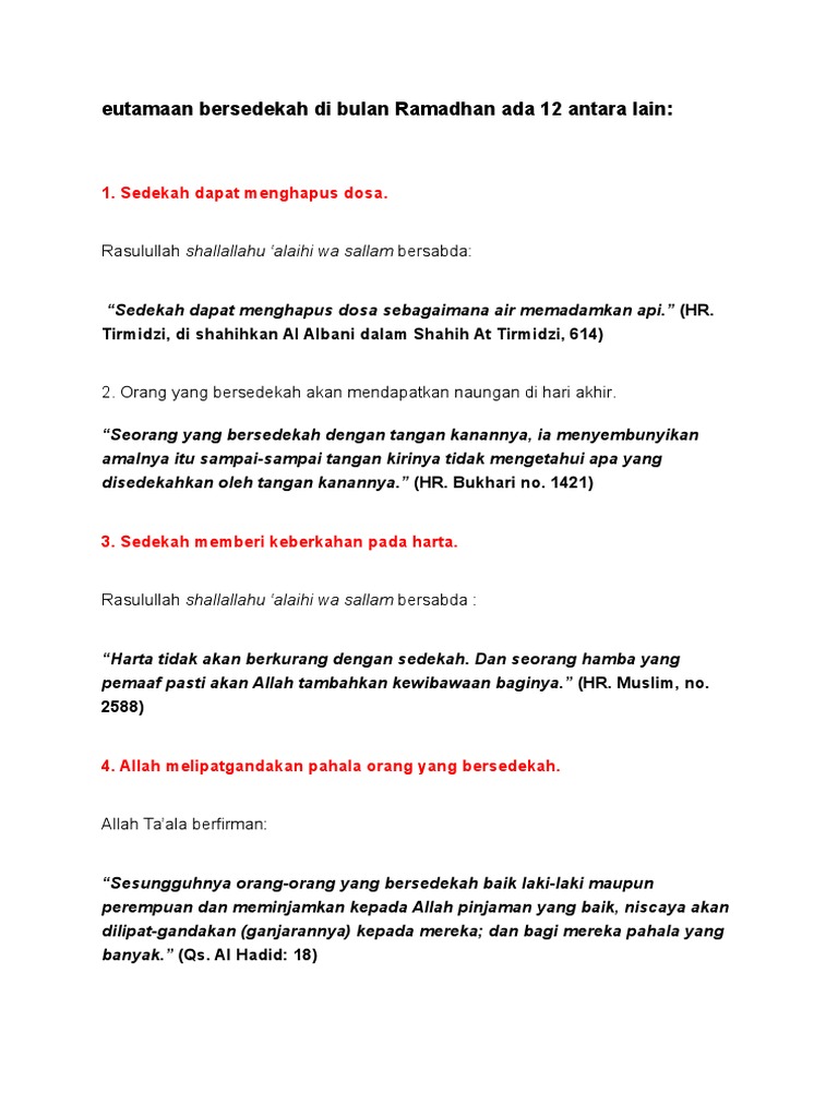Terkadang setelah berbuat salah pun manusia enggan untuk sekedar meminta maaf. Kiranya keutamaan apa yang bisa diperoleh umat muslim jika ia bersedekah. 16 keutamaan sedekah berdasarkan al quran dan hadits sedekah merupakan bukti iman dan ketaatan manusia pada allah swt.