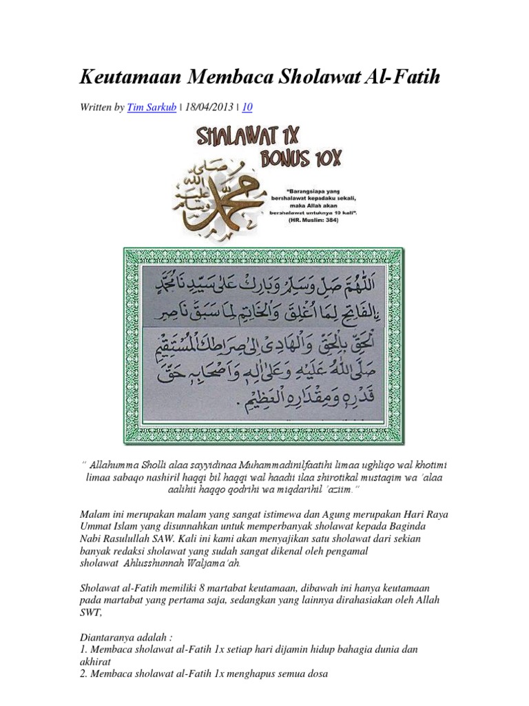 Membaca sholawat al fatih 1x menghapus semua dosa 3. Sholawat fatih ialah salah satu sholawat pembuka pintu pintu atau yang terkenal dengan sholawat pembuka pintu arsy kerajaan tuhan yang maha tertinggi terdapat beberapa keismewaan yang terkandung di dalam sholawat ini diantaranya mengatasi segala kesempitan kesulitan hidup di bebaskan dari api neraka dan akan hingga pada titik kemuliaan pangkat mahir marifat. Keutamaan shalawat al fatih yang terkenal dengan sebutan al yaqutah al faridah atas redaksi shalawat lainnya seperti lebih hebatnya burung qatha berjalan di waktu malam dibandingkan dengan rayapan semut.
