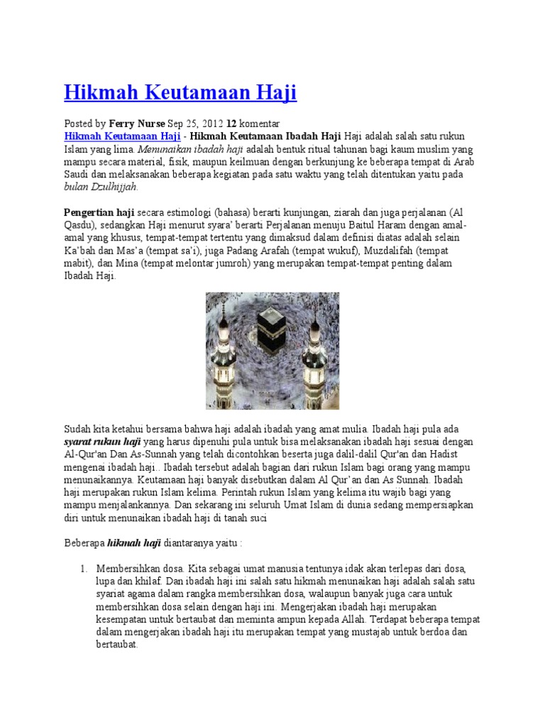 Dari abu hurairah radhiyallahu anhu ia berkata sel alnb. Ibadah haji merupakan rukun islam kelima. Keutamaan haji banyak disebutkan dalam al quran dan as sunnah.